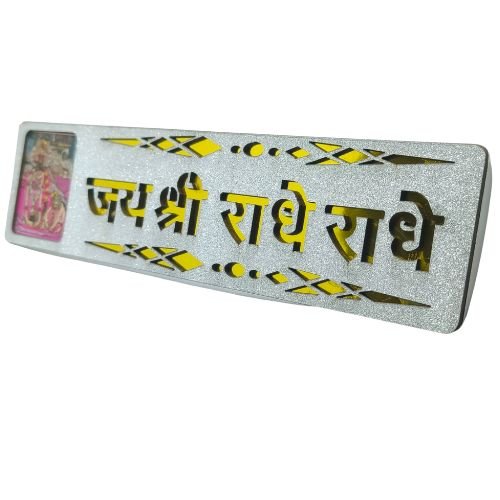 Engraved “Jai Shree Radhe Radhe” Wooden Wall Sticker with Radha Vallabh Ji Photo – Spiritual Wall Art ( 15cm by 5cm ) silver colour